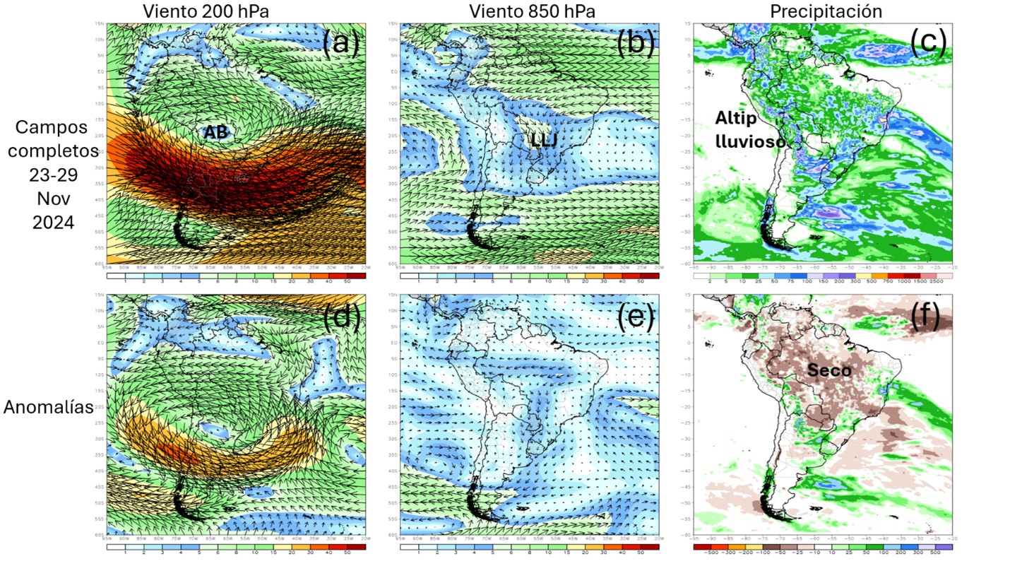 Figura 5 Los paneles superiores muestran el promedio entre el 23 y 29 de noviembre de 2024 del viento en: (a) 200 hPa (unos 12 km de altura), (b) 850 hPa (unos 1.5 km de altura) y (c) precipitación. Los paneles inferiores son las anomalías de este periodo respecto a la climatología. Fuente: Climate Prediction Center, NOAA, EEUU.