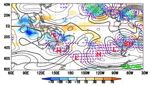 Figura 6. Anomalías de circulación entre el 20 y 27 de noviembre 2024. El sombreado indica anomalías de la radiación de onda larga saliente (OLR; W/m²). Los colores cálidos indican convección suprimida y los fríos indican convección más activa que el promedio. Los contornos negros muestran anomalías en la función de la corriente de 200 hPa a intervalos de 5×106 m²/s. Las flechas violetas indican el flujo de actividad de las ondas de 200 hPa (m²/s²). Las letras H indican altas presiones, las L son bajas presiones, BH es el Alta de Bolivia. Fuente: Centro Climático de Tokio