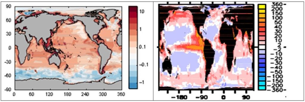 Figura 2. A) Flujo anual de CH4 (mmol m-2) y B) presión parcial de N2O (ppb). Los valores positivos significan que el flujo de GEI va desde el océano hacia la atmósfera (océano como “fuente”), mientras que los valores negativos representan el ingreso de GEI desde la atmósfera hacia el océano (océano como “sumidero”). Fuente: Weber et al. (2019) y Buitenhuis et al. (2018)