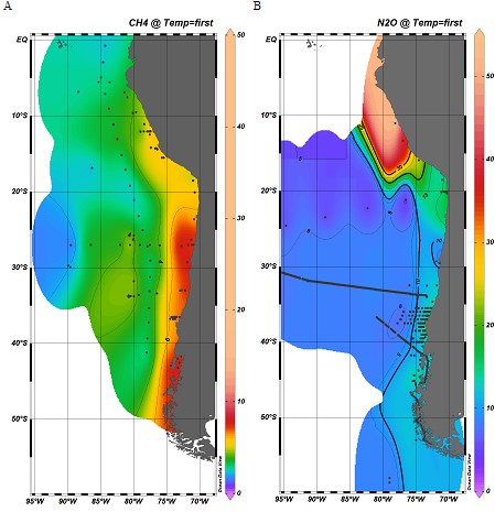 Figura 3. Distribución superficial de (A) metano (nM) y (B) óxido nitroso (nM) en la cuenca del Pacifico sur oriental, basada en datos de concentración de metano obtenido en diversos cruceros nacionales e internacionales. Se observa la diferencia en la concentración y distribución espacial del metano si la comparamos con modelos globales en Figura 2. Elaboración propia.