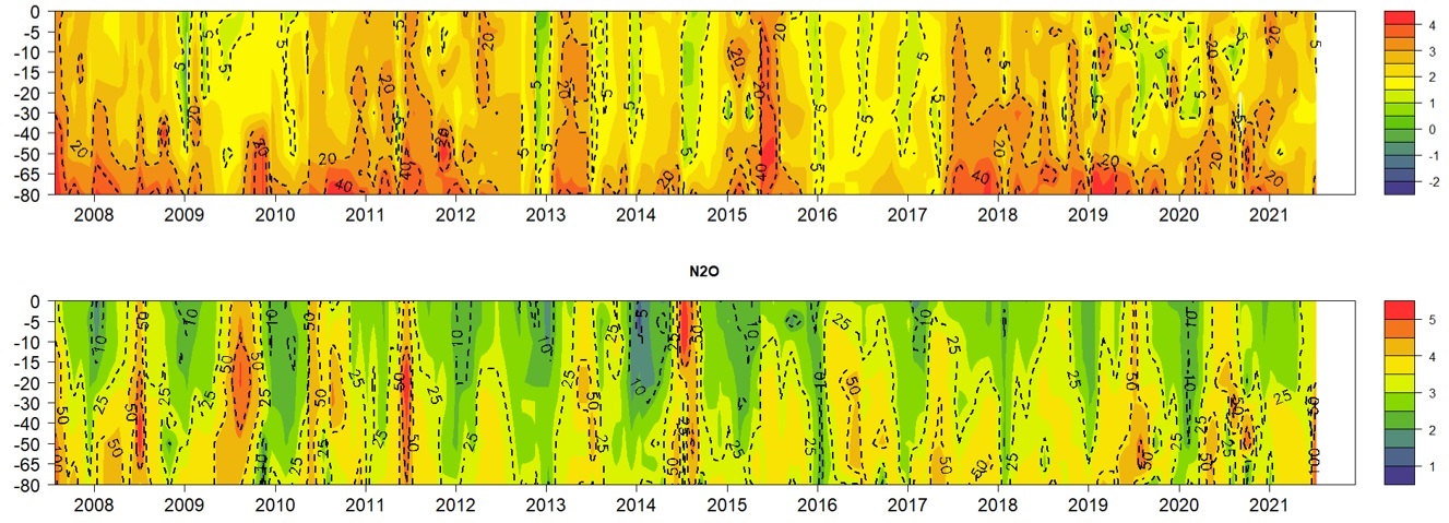 Figura 4. Serie de tiempo de a) CH4 (metano), y b) N2O (óxido nitroso), medida en la columna de agua a diferentes profundidades desde el año 2007 al presente. Se observa una variabilidad estacional con una clara acumulación de estos gases en aguas profundas durante los periodos de primavera-verano y otras acumulaciones superficiales; no obstante, existe una variabilidad interanual observada, pero aún no bien entendida. Fuente: Elaboración propia.