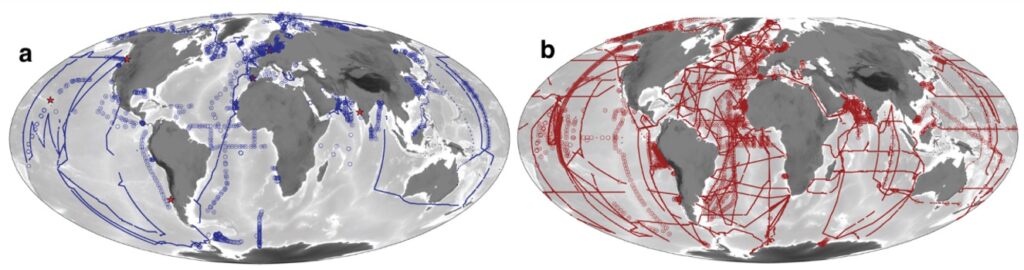 A escala global, el océano no es solo un reservorio de GEI, sino que también se comporta como emisor de, por ejemplo, metano (CH4) y óxido nitroso (N2O) a la atmósfera. Sin embargo, el cálculo de la cantidad emitida fluctúa considerablemente. Por ejemplo, el CH4 varía de 5 a 25 Tg[1] por año (Weber et al., 2019), mientras que la cantidad emitida de N2O fluctúa entre 2 y 9 Tg por año (Buitenhuis et al., 2018). Estos amplios rangos de emisiones reflejan tanto las limitaciones de los modelos globales como la escasez histórica y actual de mediciones in situ de GEI distintos al CO2, las que son obtenidas, en su mayoría, mediante muestras de agua de mar. La escasez se debe a las brechas tecnológicas aún existentes respecto al desarrollo de sensores de medición in situ. A modo de ejemplo de lo anterior, la Figura 1 muestra la cantidad de mediciones de GEI existentes al año 2020, siendo claramente deficientes para el CH4 y N2O, si lo comparamos con el CO2 (https://catalog.data.gov/dataset/global-ocean-surface-water-partial-pressure-of-co2-database-ldeo-database-version-2019-measurem2).