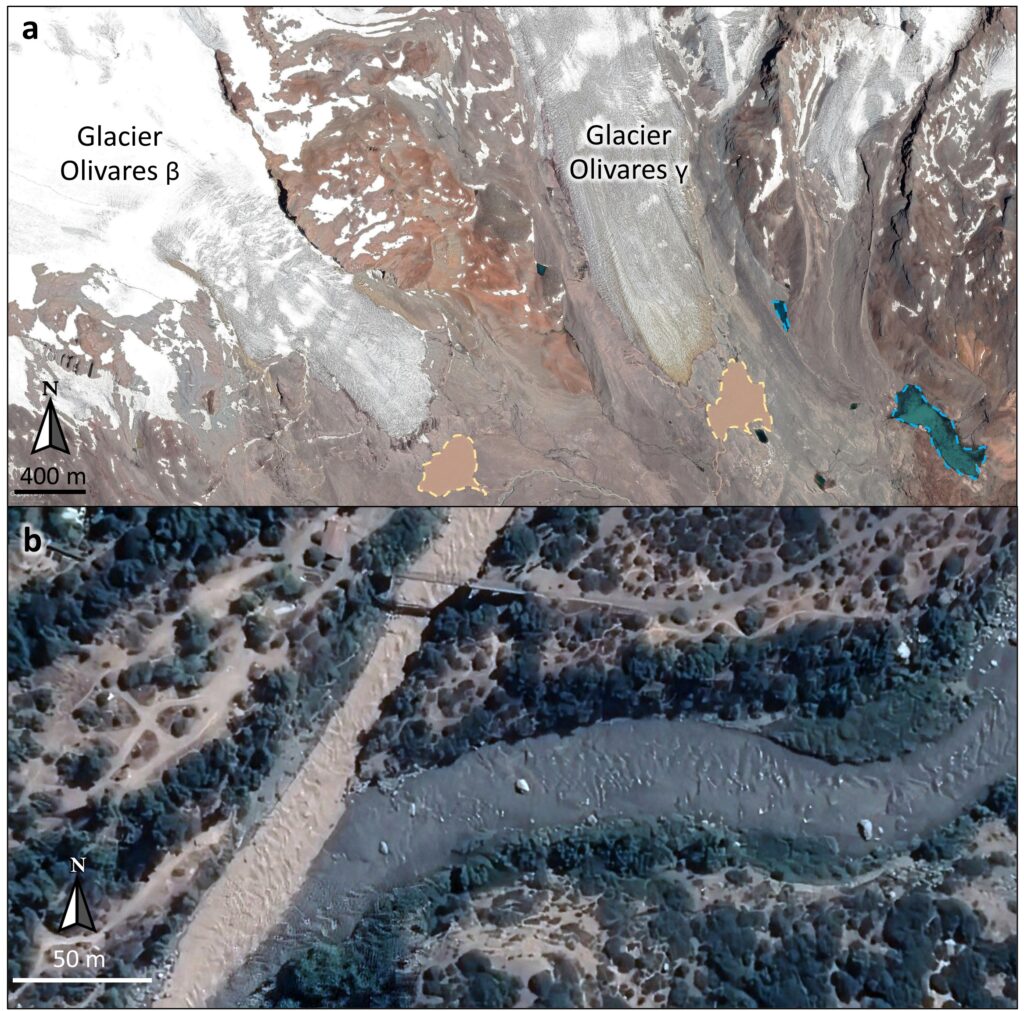 Figura 1. Imágenes de Google Earth de la cuenca del río Maipo del (a) 3/1/2014 y (b) 22/2/2016. a) Diferencia de color entre dos lagunas proglaciales de los glaciares Olivares Beta y Olivares Gamma (contorno amarillo, alta carga de sedimento), y dos lagunas al Este con una mayor contribución de derretimiento de nieve (contorno azul, baja carga de sedimento). b) La confluencia entre el río Colorado (subcuenca del norte con abundancia de grandes glaciares blancos) y el río Maipo, apenas unos kilómetros aguas arriba de la estación de turbidez.