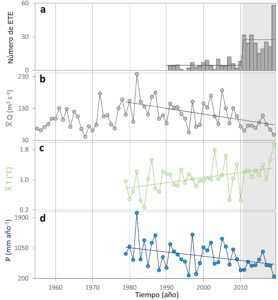 Cuando en el río Maipo hay valores por encima de 4.000 UNT la planta potabilizadora de Aguas Andinas interrumpe la toma de agua por exceso de sedimento, comprometiendo el abastecimiento de agua potable para Santiago. Entre los años 1990 y 2010 ocurrían cerca de cinco eventos de turbidez extrema (ETE) por año (la mayoría concentrados en la época estival). Sin embargo, el numero promedio anual de ETE ha aumentado a veintisiete en la última década (Figura 2). Este abrupto cambio también se observa en otros registros del mismo río Maipo y del Aconcagua, contrastando con las tendencias más graduales de temperatura y precipitación en esta zona (Figura 2; Boisier et al. 2018; Falvey & Garreaud 2009). Así, surge la interrogante de cuáles fueron las razones detrás del abrupto aumento en el número de ETE, un tema recientemente abordado por la investigación de Vergara, Garreaud & Ayala (2022), y que se resume a continuación.