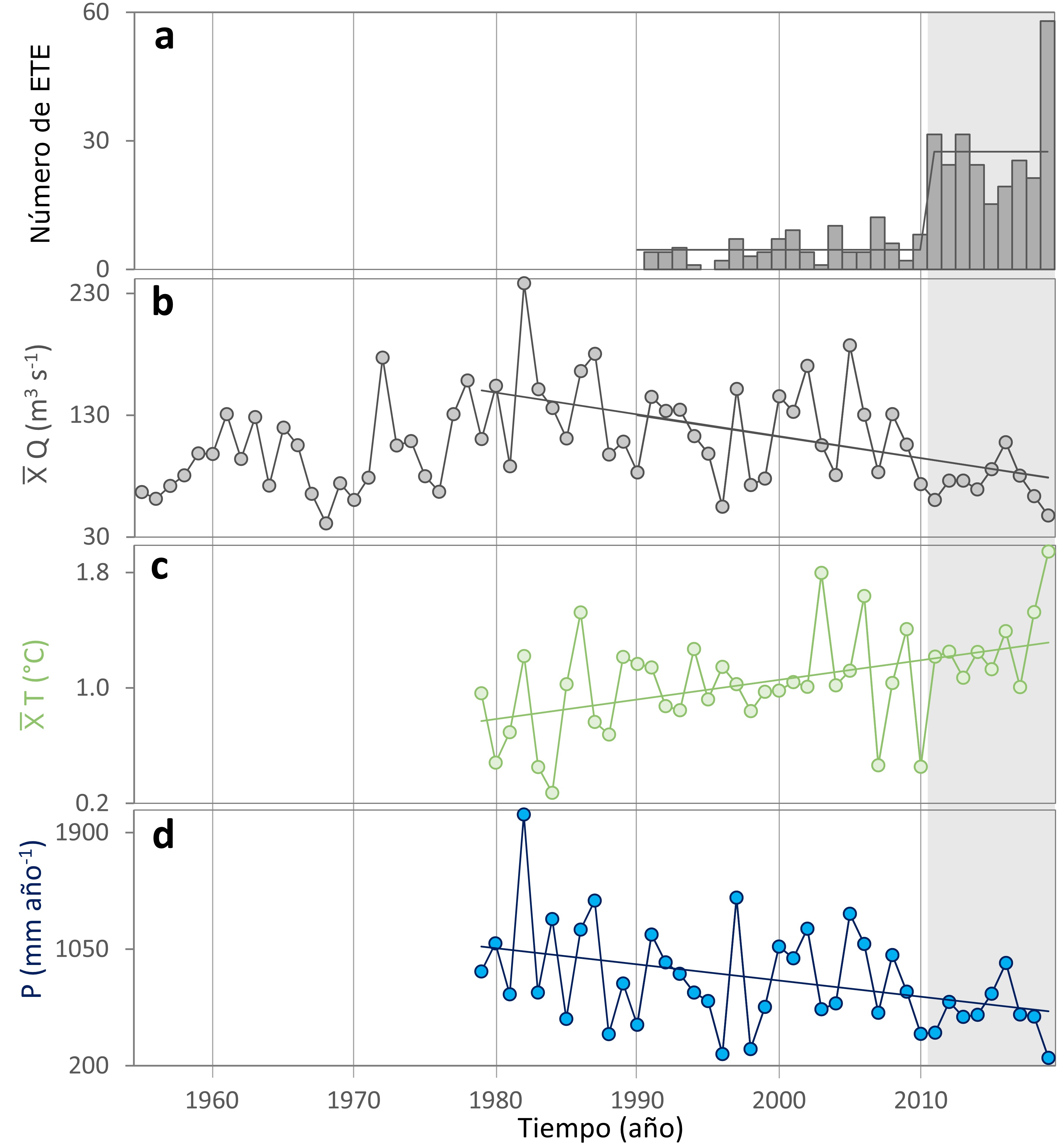Figura 2. Series anuales de (a) número de Eventos de Turbidez Extremos, (b) caudal líquido, (c) temperatura y (d) precipitación de la cuenca del río Maipo.