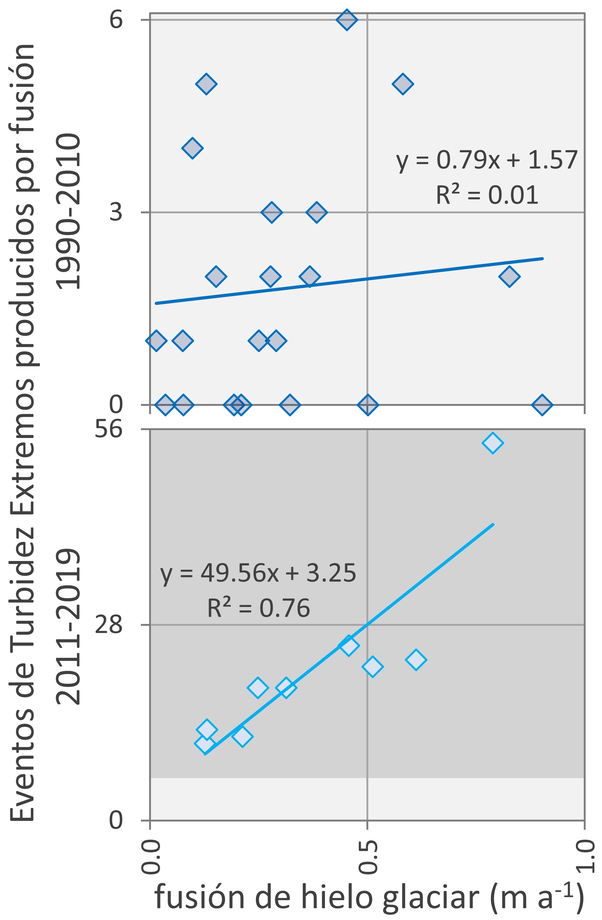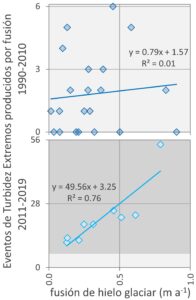 Figura 3. Gráficos de dispersión entre el número anual de Eventos de Turbidez Extremos provocados por fusión y el derretimiento estival de hielo, para el período anterior (1990-2010) y posterior (2011-2019).