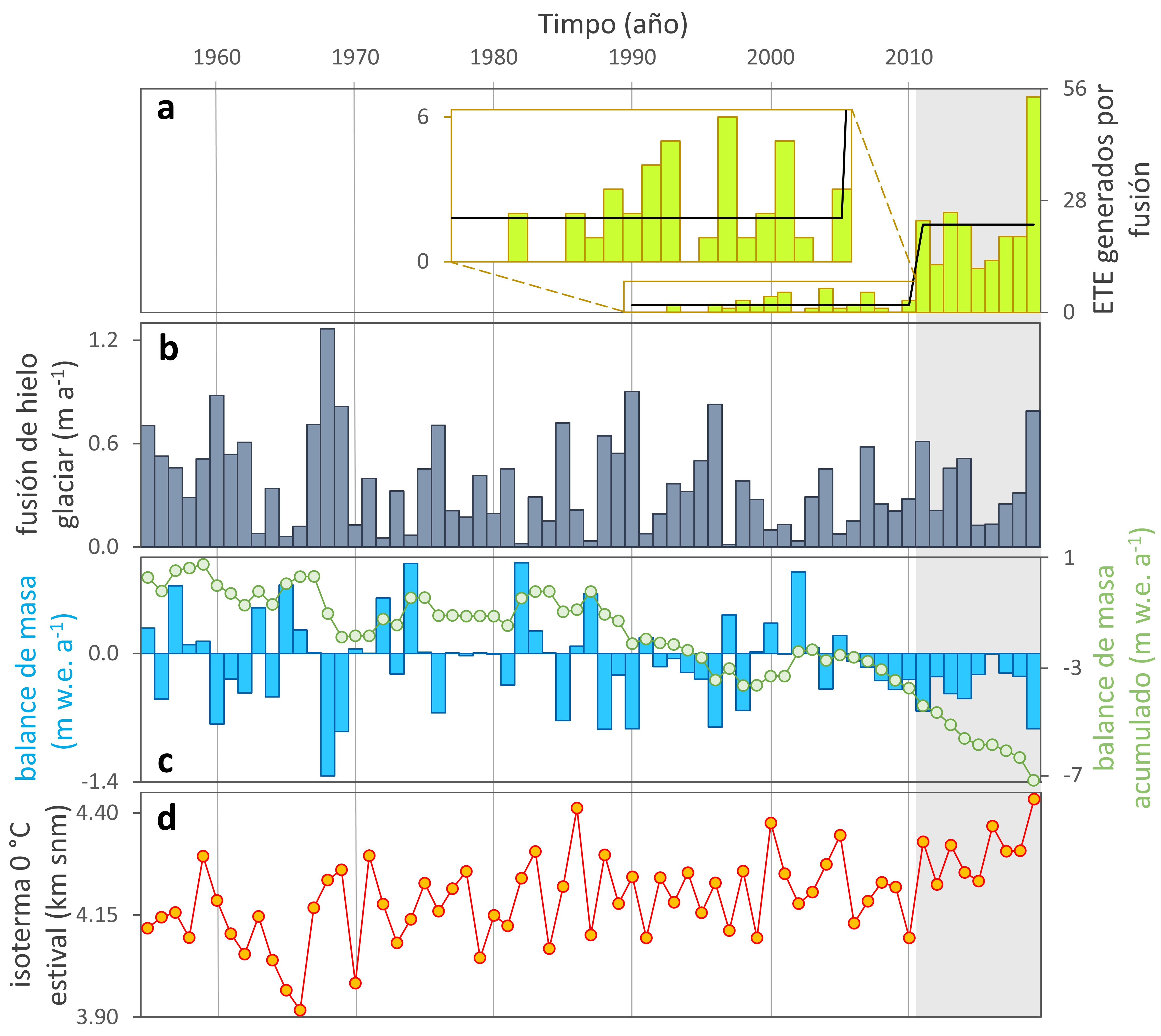 Figura 4. Series anuales de (a) número de Eventos de Turbidez Extremos provocados por fusión, (b) fusión estival de hielo, (c) balance de masa glaciar regional, y (d) isoterma de 0 °C estival media. Los datos glaciológicos fueron extraídos de Ayala et al. (2020).