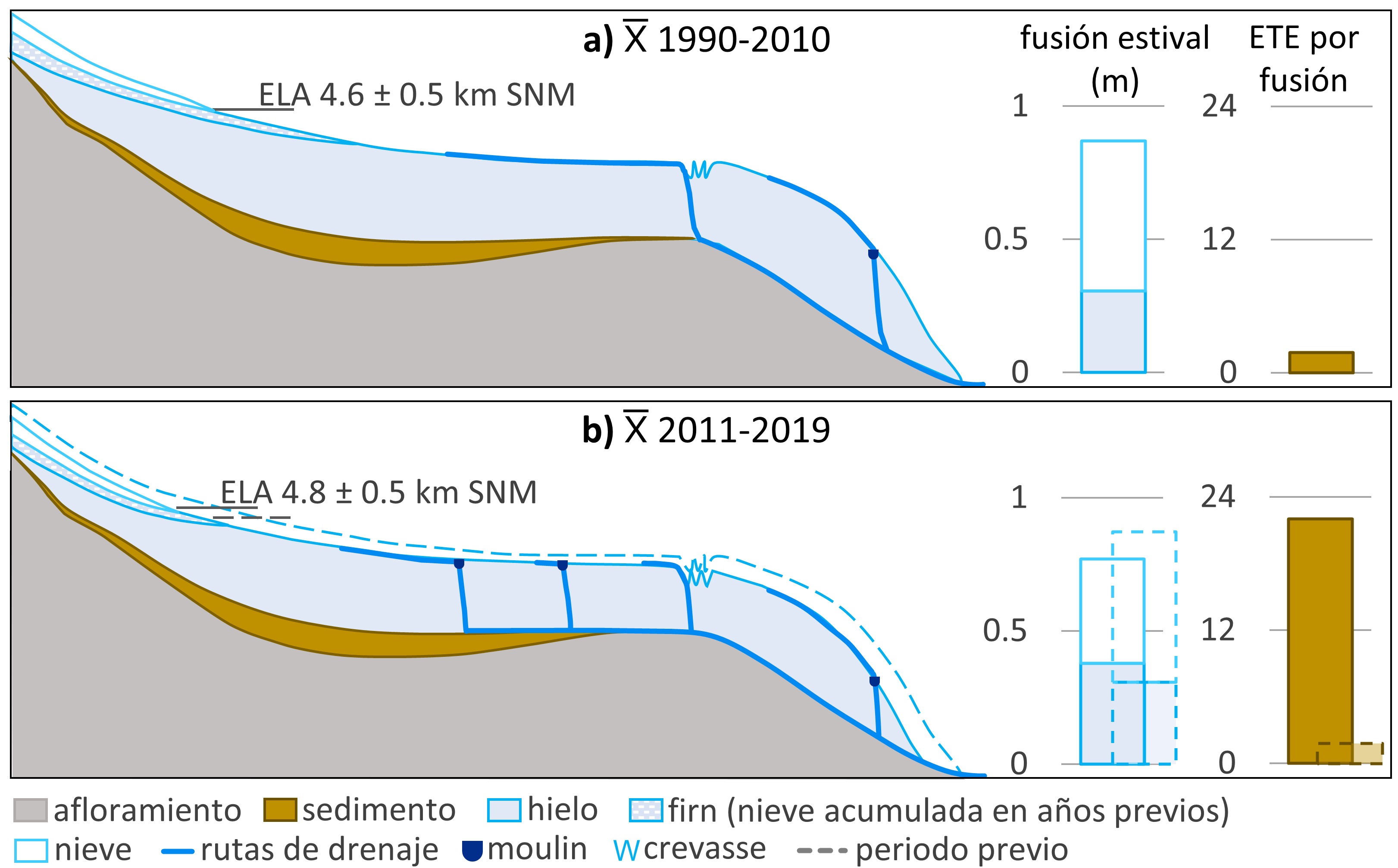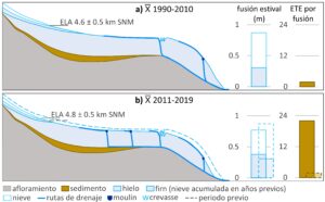 Figura 5. Modelo conceptual del efecto de los cambios glaciares sobre la disponibilidad y conectividad hidrológica del sedimento subglaciar. (a) Situación en 1990-2010 y (b) 2011-2019.