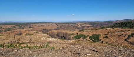 Figura 2. Paisaje forestal tras diferentes eventos de tala rasa y eliminación de árboles quemados en Cauquenes, donde se puede apreciar la erosión del suelo. Cordillera de la Costa, Región del Maule, abril de 2017. Fotografía de Susana Gómez-González.