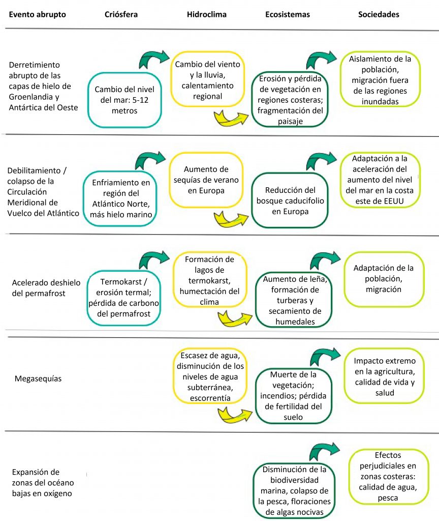 Figura 1: Ejemplo de diversos cambios abruptos ocurridos en el pasado y cascada de consecuencias en los distintos sistemas. Fuente: Elaboración propia.