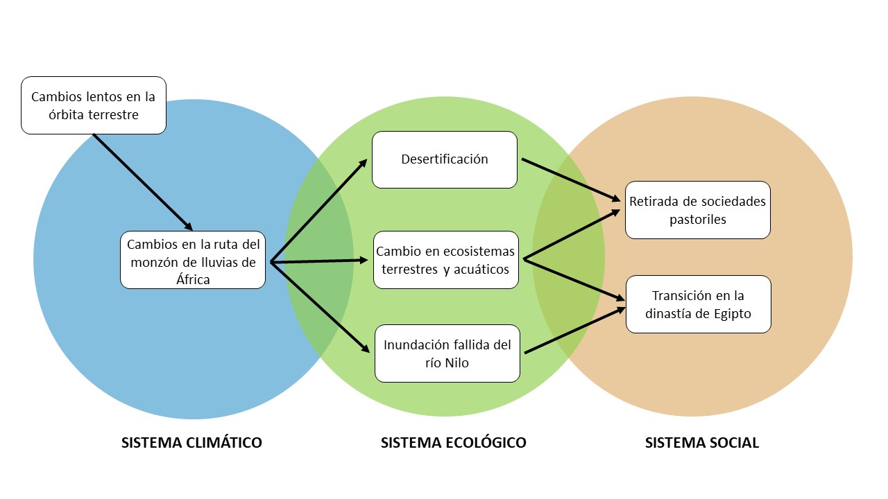 Otro ejemplo que incluye también el sistema social ocurrió durante el Período Húmedo de África (PHA), momento en que el Sahara era un espacio verde con hierba y lagos (Figura 2). Cuando las variaciones naturales a largo plazo de la órbita del planeta llegaron a un valor umbral, esto provocó en pocas décadas un desplazamiento de la ruta del monzón de África del Norte, disminuyendo las precipitaciones. Esto conllevó al término del PHA, con secamiento de lagos, erosión del suelo, emisiones de polvo, sequía y estableciendo, finalmente, el desierto del Sahara. Estos cambios, a su vez, hicieron colapsar a los vertebrados terrestres en la región, además de modificar a las sociedades pastoriles del norte de África (por ejemplo, la transición del Imperio Antiguo de Egipto al Nuevo).