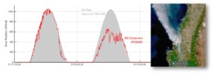 Al día siguiente (18 de enero), cuando el incendio aún no estaba controlado, la temperatura subió a 36,5 °C en Chillán, un valor extremo que se registra en aproximadamente el 1 % de los días de verano. En Concepción, la temperatura se mantuvo similar, en parte, debido a que la densa columna de humo redujo considerablemente la radiación solar en la superficie, según las mediciones de la boya costera POSAR ubicada frente a Concepción (Fig. 12).