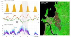 Chillán y Concepción cuentan con estaciones meteorológicas operadas por la Dirección Meteorológica de Chile, con varias décadas de registros de alta calidad, pero ninguna de ellas registra realmente las condiciones de la zona donde se originó el incendio (Chillán está demasiado tierra adentro y Concepción demasiado cerca de la costa). Por eso, a continuación, mostramos los registros de una estación meteorológica no oficial obtenida de Weather Underground (ITOM) cerca del incendio (Fig. 13).