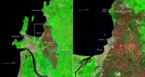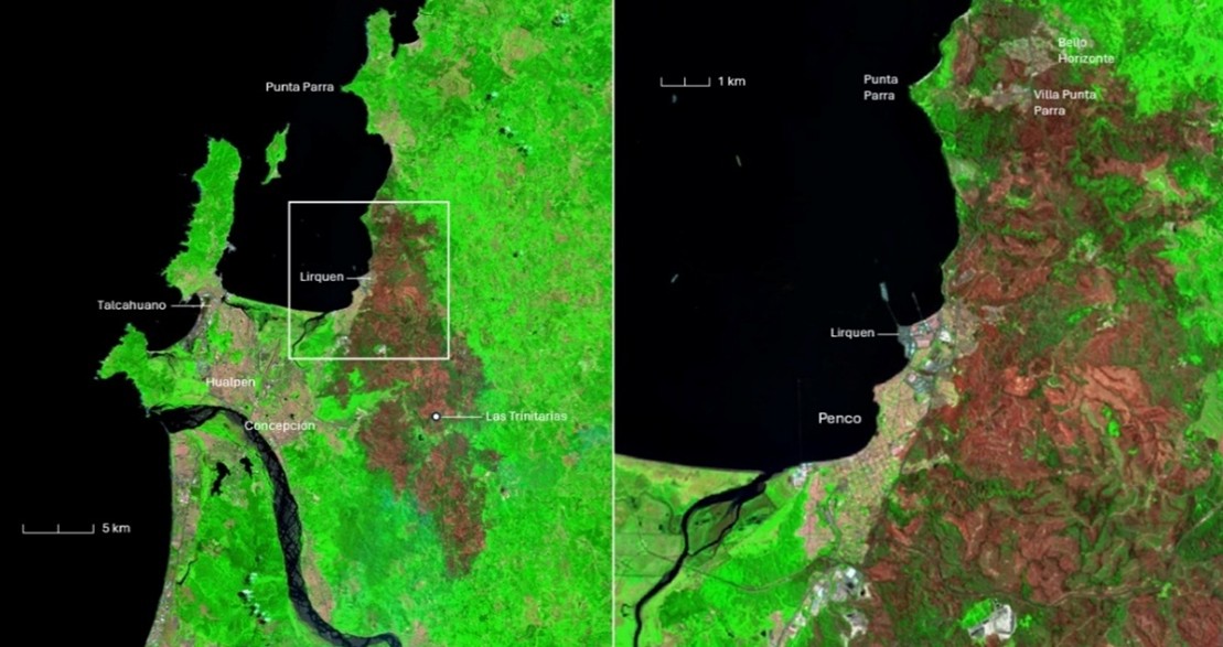 Impulsado por fuertes vientos del sursuroeste, el fuego se propagó rápidamente desde los puntos de ignición en la cordillera de la costa hacia el borde costero, manteniéndose activo durante las siguientes 48 horas, alcanzando la localidad de Penco-Lirquén y la aldea de Punta Parra. Fue en estas localidades donde el incendio causó la lamentable cifra de 19 víctimas mortales, destruyó miles de viviendas y dañó infraestructura crucial. Además, quemó 20.000 hectáreas en un paisaje dominado principalmente por plantaciones forestales exóticas, como se muestra en la siguiente imagen del satélite Sentinel 2A (canal SIWR) pocos días después de que el incendio fuera controlado (Fig. 2).