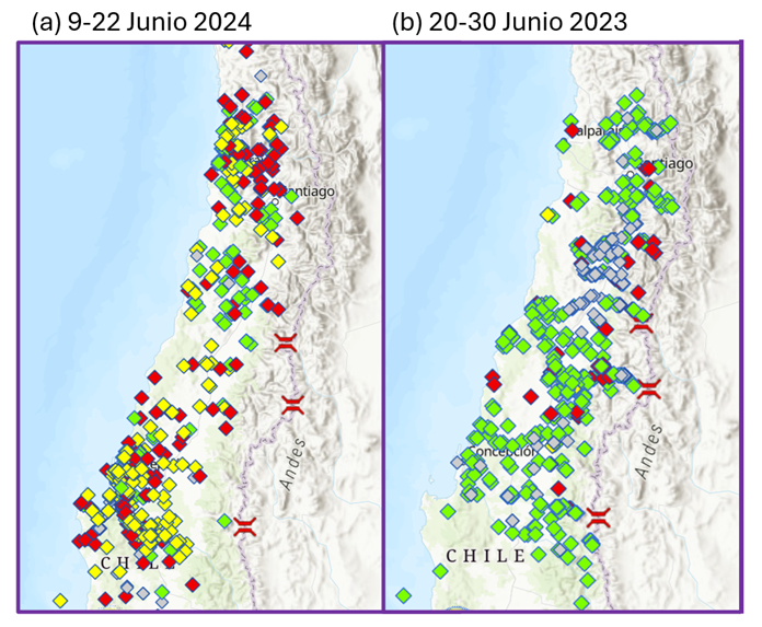 Figura 1. Emergencias reportadas por la Dirección de Vialidad del Ministerio de Obras Públicas para el periodo (a) 9-22 de junio de 2024 y (b) 20-30 de junio de 2023. Cada símbolo representa un incidente. El color indica el estado de la ruta al momento de acceder a la plataforma (1 de julio 2024). Fuente: Portal GEOMOP, https://ide.mop.gob.cl/Emergencias/#/home.