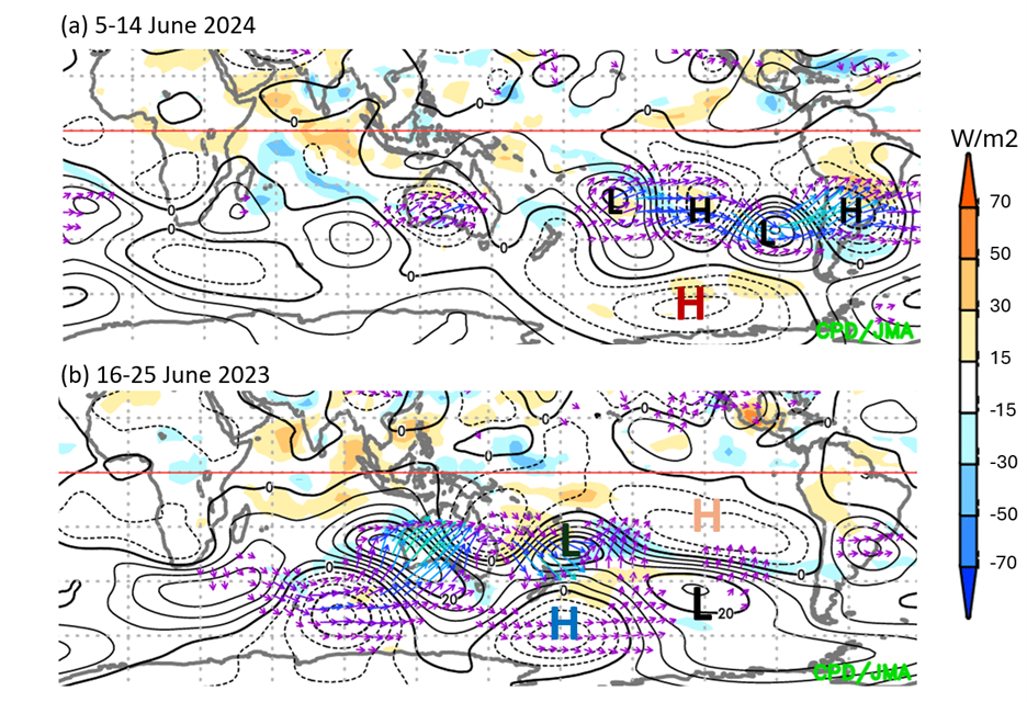 Figura 10. Promedio de anomalías de la función corriente en 200 hPa (contornos negros), radiación infrarroja emergente (colores) y flujo de actividad de onda (flechas) durante (a) 5 al14 de junio 2024 y (b) 16 al 25 de junio 2023. Ver texto para más detalles. Fuente: Tokyo Climate Center.
