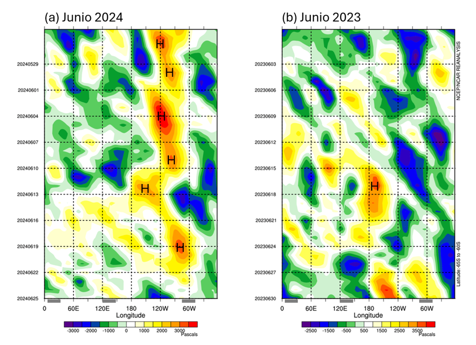 Figura 11. Diagramas de Hovmöller (longitud tiempo) de las anomalías de presión a nivel de mar (en pascales) promediadas entre los 65°S y 60°S para (a) junio de 2024 y (b) junio de 2023. Las letras H indican la ubicación del anticiclón descrito en el texto.