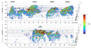 A fines de junio de 2023 comentamos sobre el retorno de los gigantes debido a otro periodo excepcionalmente lluvioso en Chile central. El panel inferior de la Figura 2 muestra el diagrama latitud-tiempo entre el 16 y 30 de junio de dicho año, donde se observa un solo evento de precipitación que comenzó el día 22 y se extendió hasta seis días en algunas estaciones. En contraste con las tormentas del 2024, el pulso del 2023 se inició en forma mas o menos simultanea entre la región de Los Lagos y la Metropolitana (45-33°S) y, luego, las precipitaciones más intensas, con acumulaciones sobre los 10 mm/hr, se mantuvieron estacionarias entre las regiones de O’Higgins y de Ñuble.