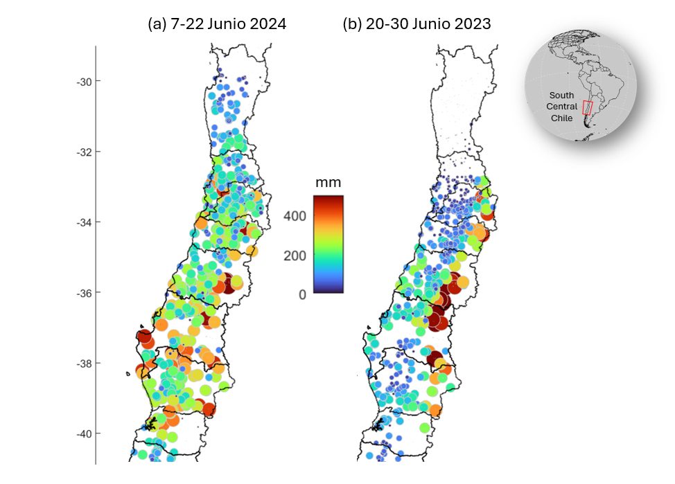 Se modificó la Figura 3 y su lectura debido a una corrección en las fechas. Anteriormente decía: Precipitación acumulada en estaciones de Chile central (DGA, DMC y Agromet) durante el periodo (a) 7-22 de junio de 2023 y (b) 20-30 junio 2024. Datos horarios desde DMC, DGA, CEAZA, Agromet y RedMeteo, obtenidos desde VisMet. Ahora dice: (a) 7-22 de junio de 2024 y (b) 20-30 de junio 2023.