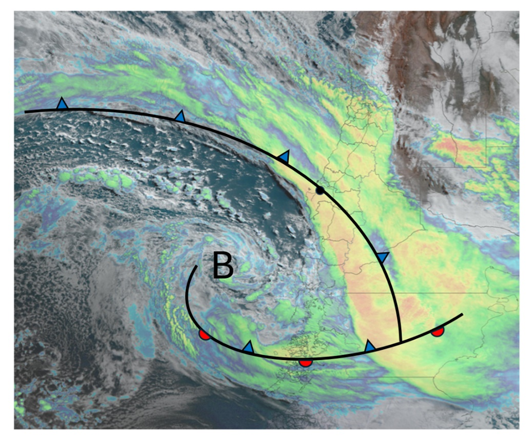 Figura 4. Imagen satelital (GOES 16) del 20 de junio de 2024 a las 18 UTC (15 hora local). Sobre la imagen visible (nubes en color blanco o gris) se superpuso la imagen infrarroja, donde los colores amarillos y naranjos indican las nubes con mayor desarrollo vertical. La posición aproximada del frente frío se indica en la línea con triángulos, el frente cálido la línea con semicírculos y el frente ocluido la línea con ambos símbolos. Además, la ubicación de centro de baja presión se identifica con la letra B. El pequeño circulo negro indica la ciudad de Concepción.