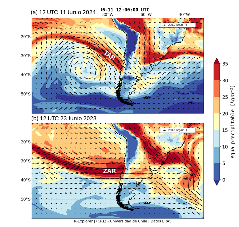 Figura 5. Mapas del contenido total de vapor de agua en la columna (agua precipitable en escala de colores) y transporte integrado de vapor (IVT, flechas negras) para (a) el 11 de junio del 2024 y (b) 23 de junio de 2023. El eje del TAR (río atmosférico inclinado) y ZAR (río atmosférico zonal) se indican en cada caso. Fuente de datos: ERA-5 visualizados a través de R-Explorer.