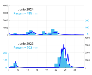 Figura 6. Datos horarios de caudal (línea azul) del río Achibueno en la Recova (36°S, 71.4°W) y datos diarios de precipitación (barras celestes) en la estación Juan Amigo para el periodo entre el 7 y el 30 de junio de (a) 2024 y (b) 2023. Fuente: DGA.
