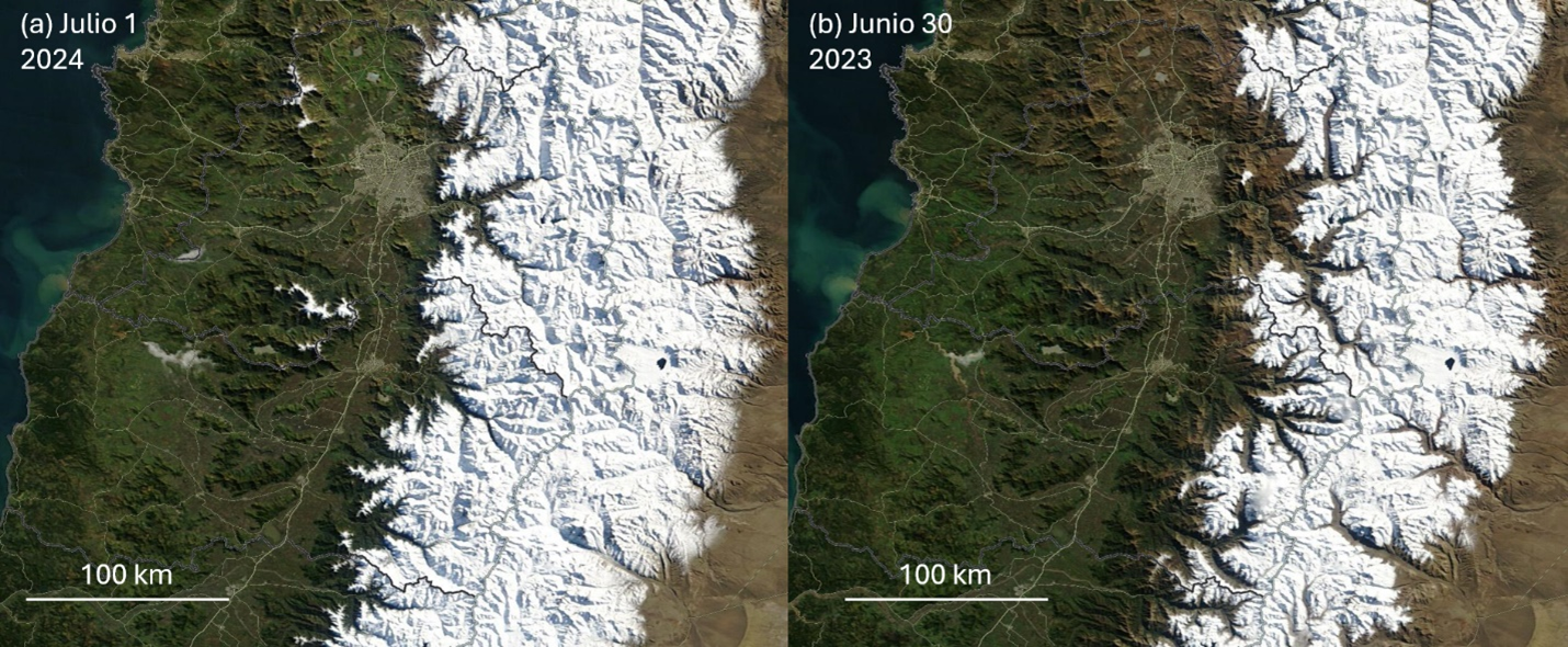 La cobertura nival a fines de junio es relevante, pues determina los recursos hídricos disponibles para el verano. Debido a la diferencia entre las condiciones térmicas de las tormentas ya descritas, la actual cobertura nival (hasta este 1 de julio) es sustancialmente mayor que su contraparte de hace un año, como se aprecia en las imágenes satelitales de la Figura 7. A modo de ejemplo, la cuenca del río Tinguiririca (al oriente de San Fernando en la región de O’Higgins) tiene, actualmente, un 92 % de su área cubierta por nieve, en contraste con el 52 % que presentaba hace un año atrás, según los datos del Observatorio Andino en base a imágenes MODIS.