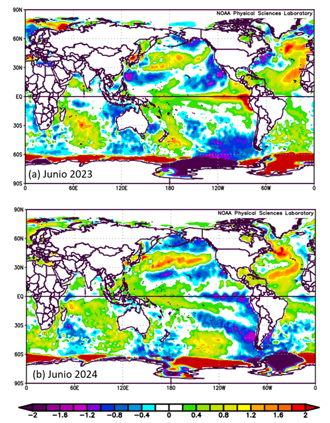 Figura 8. Anomalías de temperatura superficial del mar en (a) junio de 2023 y (b) junio de 2024. Las anomalías corresponden a la diferencia con la condición promedio 1990-2020.
