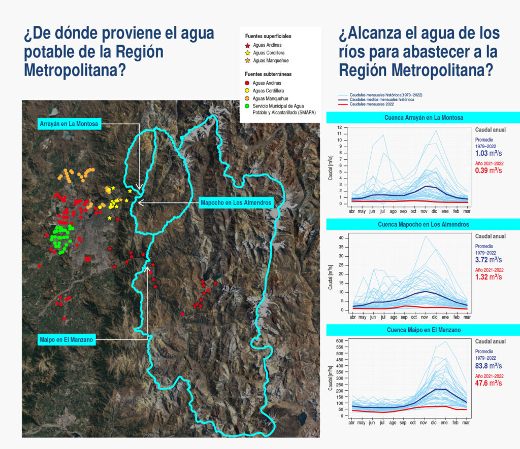 Figura 1. Origen del agua potable que se consume en la Región Metropolitana. Los datos de caudal se obtuvieron del Explorador Climático (CR)2 (1979-2020) y de la página de la Dirección General de Aguas (DGA): https://snia.mop.gob.cl/