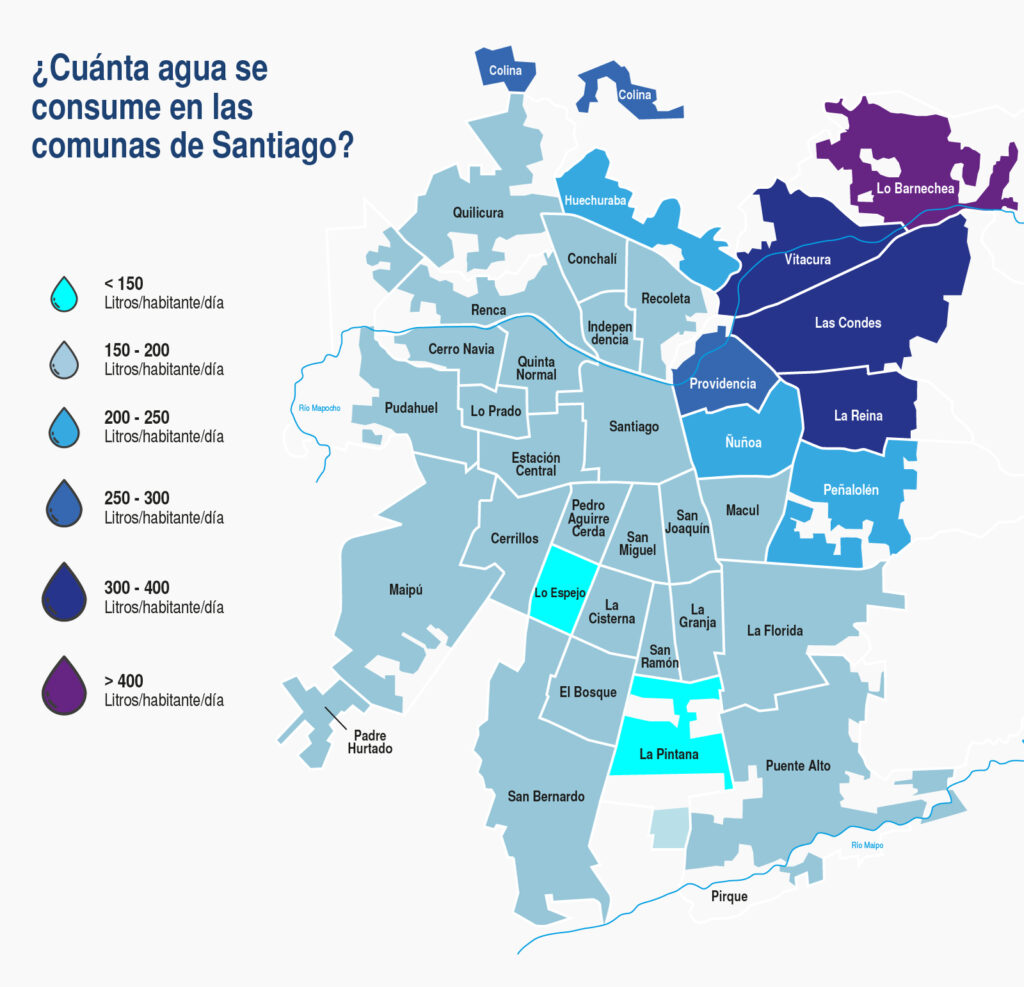 Figura 2. Consumo promedio de agua potable residencial per cápita (L/hab/día) por comuna. Estos consumos consisten en agua que sale de la llave. Las pérdidas del sistema son estimadas en un paso posterior.