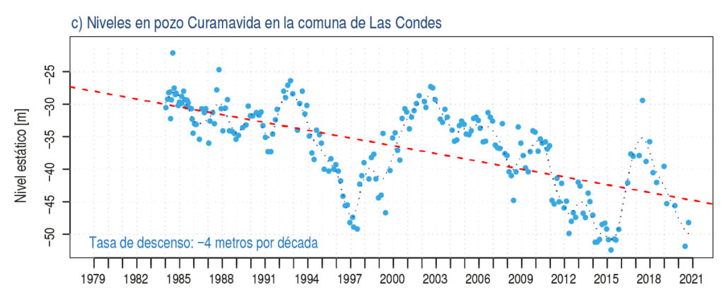 Otra parte del déficit entre disponibilidad y requerimientos para lo zona oriente se suple a partir de reservas subterráneas, con extracciones que cada vez presentan más dificultades debido al descenso sostenido de los niveles de las aguas del subsuelo en la zona, como lo muestran los registros de un pozo de observación de la comuna de Las Condes (Figura 4).