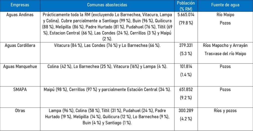 La Región Metropolitana (RM) se encuentra dentro de la cuenca del río Maipo, cuyas cuencas cabeceras conformadas por ríos y esteros que tributan al río Maipo, conforman la fuente primaria de abastecimiento de agua. Para la conurbación del Gran Santiago, el agua se obtiene desde fuentes superficiales y subterráneas (Tabla 1 y Figura 1).