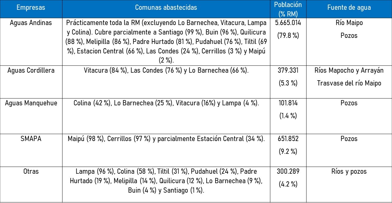 A continuación, se describen las fuentes de abastecimiento de agua, y las empresas sanitarias encargadas de su potabilización y distribución, así como las demandas de agua potable que estas empresas satisfacen. En base a un análisis de la relación entre disponibilidad y requerimientos de agua, se exponen los problemas de seguridad hídrica en la región y se entregan recomendaciones para afrontar los problemas de escasez en Santiago.