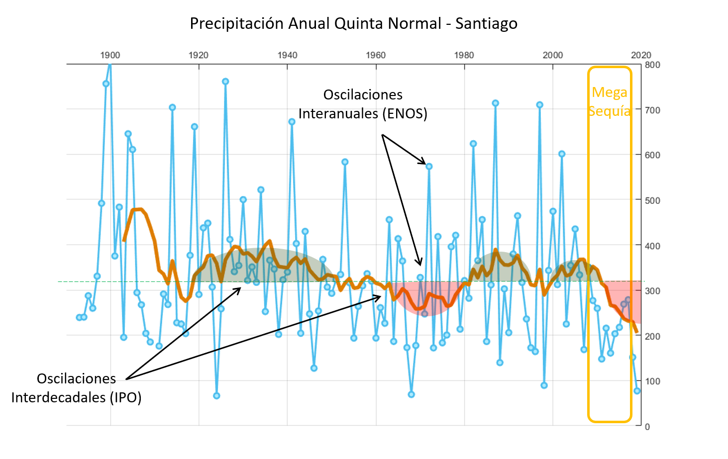 La zona central de Chile está en la transición entre una de las regiones más secas del planeta –el desierto de Atacama- y una región lluviosa en latitudes medias. Esta condición limítrofe, hace que la acumulación anual dependa de unas pocas tormentas y sea susceptible a pequeñas variaciones en la posición e intensidad del anticiclón del Pacífico subtropical y la banda de vientos del oeste en latitudes medias. Varios fenómenos de escala global –ENSO, MJO, PDO y SAM- afectan los dos elementos anteriores en distintas escalas de tiempo, desde los meses a las décadas, produciendo un régimen de precipitación muy “inestable” en Chile central. Esta variabilidad ha sido parte de la historia de nuestro territorio como queda de manifiesto, por ejemplo, en las crónicas de terribles aluviones y grandes sequías desde la conquista al siglo XIX (Vicuña Mackenna, 1877) y también en nuestra historia reciente. Aunque compleja, la dependencia de la precipitación en Chile central a modos globales ofrece algún grado de predicción en el mediano plazo mediante técnicas que están en permanente desarrollo. Superpuesta a estas variaciones, el cambio climático antropogénico cambiará el régimen de precipitaciones hacia una condición más seca, aunque no exento de peligros hidrometeorológicos (Mardones & Garreaud 2020). La magnitud de la disminución de precipitación proyectada para el resto del siglo XXI presenta un amplio rango, incluyendo un escenario en que la condición media sea similar a la actual Megasequía, la cual depende directamente del escenario de emisiones de gases de efecto invernadero.
