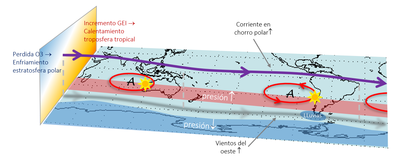 El incremento de la temperatura en gran parte del planeta durante los últimos 100 años es el aspecto más conocido del cambio climático producido por múltiples actividades humanas (Garreaud 2020a). Estas han provocado un aumento de la concentración atmosférica de gases con efecto invernadero (GEI) y una disminución del ozono en la estratósfera. El aumento de los GEI ha causado un calentamiento marcado en la tropósfera alta sobre los trópicos y subtrópicos, mientras que la disminución del ozono ha producido un enfriamiento de la estratósfera sobre latitudes altas del hemisferio sur. Estas tendencias divergentes de la temperatura del aire acrecientan el contraste térmico norte-sur entre los 10 y 15 km de altura, intensificando el anillo de máximo viento del oeste conocido como la corriente en chorro polar (Figura 8). La aceleración de los vientos en altura es transferida hacia abajo causando la intensificación de los oestes en superficie sobre el océano Austral. La intensificación del flujo demanda una readecuación del campo de presión a nivel del mar, causando un aumento circumpolar de presiones en torno a los 40°S en las últimas décadas y una caída de la presión sobre la Antártica, lo que se conoce como la fase positiva del modo anular del sur (SAM, por sus siglas en inglés).