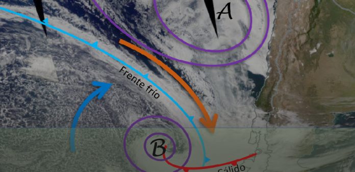 La zona central de Chile, entre las regiones de Coquimbo y del Maule, concentra más del 60 % de la población nacional y recibe en promedio entre 100 y 1000 mm de precipitación dependiendo de la latitud y altitud, configurando un clima mediterráneo y semiárido. No son muchas las tormentas que llegan a esta zona del país: entre 5 y 15 cada año, y, generalmente, de uno o dos días de duración, con cerca de un 90 % de la lluvia cayendo entre los meses de abril a septiembre. Estos eventos son producto del paso de sistemas frontales cuyo desarrollo está asociado a centros de baja presión (depresiones), como la que muestra la Figura 2. Las depresiones transitan preferencialmente entre los 45°S y 60°S, inmersas en el cinturón de vientos del oeste que da vuelta al hemisferio, de manera que los sistemas frontales deben tener una gran extensión para llegar a Chile central. El avance hacia el norte de estos sistemas es restringido por una zona de alta presión y estabilidad atmosférica que se ubica en forma casi permanente sobre latitudes subtropicales de todo el planeta. Frente a la costa del norte y centro de Chile esta zona corresponde al Anticiclón del Pacífico Suroriental o, simplemente, “el Anticiclón del Pacífico”.