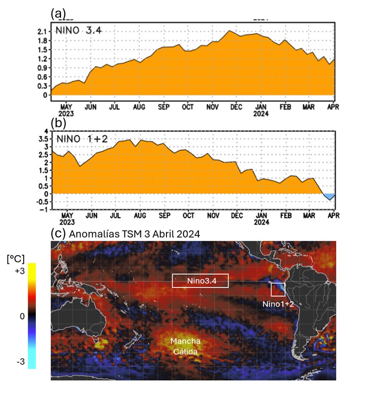 Figura 1. Paneles (a) y (b) muestran la evolución semanal en °C de los índices Niño3.4 y Niño1+2, respectivamente, durante los últimos 12 meses (Fuente: Climate Prediction Center / NCEP). El panel (c) muestra el mapa de anomalías de la Temperatura Superficial del Mar (en °C) para la semana entre el 27 de marzo y el 3 de abril de 2024 (Fuente: OI SST V2.1 / PSL / NOAA). En el mapa también se muestran las regiones empleadas para definir los índices Niño3.4 y Niño1+2.