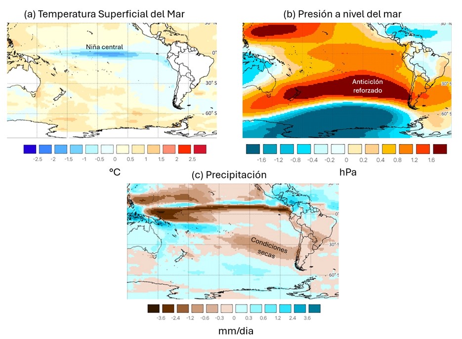 Para intentar predecir el estado más probable del clima con varios meses de antelación se utilizan modelos numéricos que simulan el sistema acoplado océano-atmósfera. La Figura 2a, por ejemplo, muestra las anomalías de TSM, presión a nivel del mar y precipitación empleando el promedio de varios modelos para el trimestre julio-agosto-septiembre del año 2024. Se destacan las anomalías negativas de la TSM entre -1 °C y -1.5 °C en el Pacifico ecuatorial, desde la costa de Sudamérica hasta la línea del cambio de fecha (180°W), con un máximo entre los 120°-160°W, justamente, la zona empleada para calcular el índice Niño3.4.