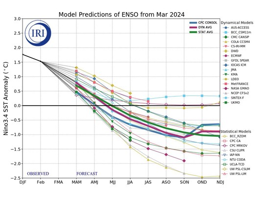 Figura 3. Predicción climática del índice Niño3.4 para los trimestres de 2024. Por ejemplo, JAS corresponde al trimestre julio-agosto-septiembre de 2024. Cada línea delgada corresponde a un modelo predictivo. La curva gruesa azul corresponde al consenso de los modelos. Figura generada por el International Reseach Institute, University of Columbia.