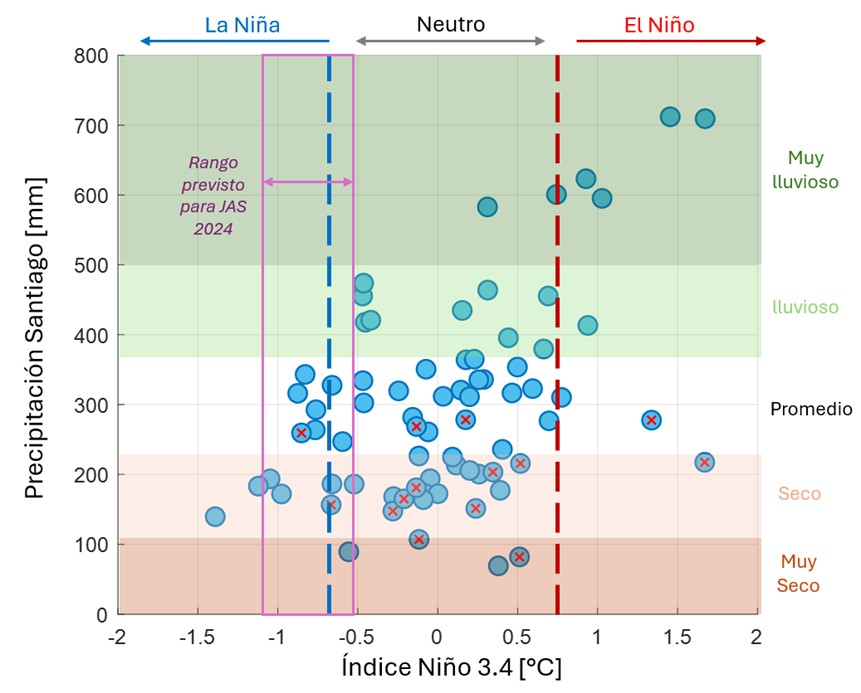 Figura 4. Diagrama de dispersión entre el índice Niño3.4 en invierno (junio-julio-agosto) y la precipitación anual en Santiago (Quinta Normal, con datos de la Dirección Meteorológica de Chile). Cada circulo corresponde a un año entre 1950 y 2023. Los círculos con una cruz corresponden al periodo 2010-2023. El rango más probable de índice Niño3.4 para el invierno 2024 está indicado por el rectángulo color violeta.
