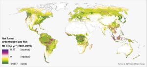 Figura 1: Flujo global de carbono en ecosistemas forestales. Los valores corresponden al flujo de carbono por cada unidad de análisis de aproximadamente 30×30 m. Fuente: Harris et al. (2021).