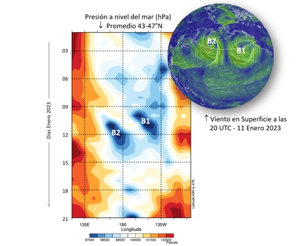 Figura 2. Presión atmosférica a nivel del mar durante los primeros días de enero y vientos superficiales el 11 de enero en el océano Pacífico Norte. Gentileza: René Garreaud.