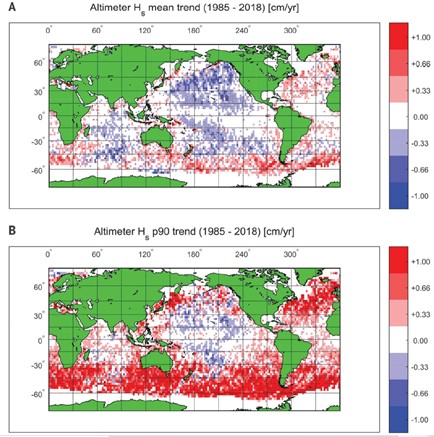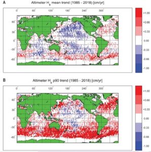 Figura 3. Tendencias de la altura del oleaje durante el período 1985–2018. (A) Tendencia de las alturas medias. (B) Tendencias de las alturas extremas del oleaje (percentil 90). Fuente: Young & Ribal (2019).