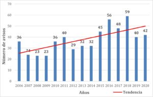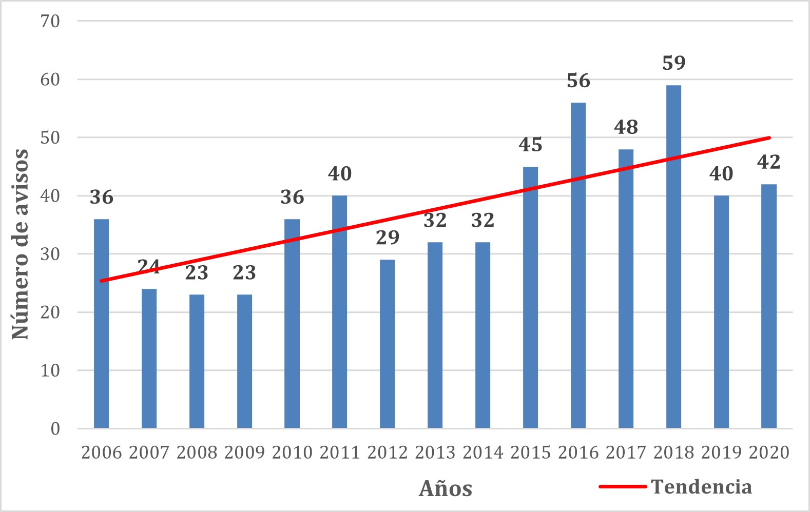 Figura 4. Avisos de marejadas emitidos por el Servicio Meteorológico de la Armada entre 2006 y 2020. Fuente: CAMPORT (2021).