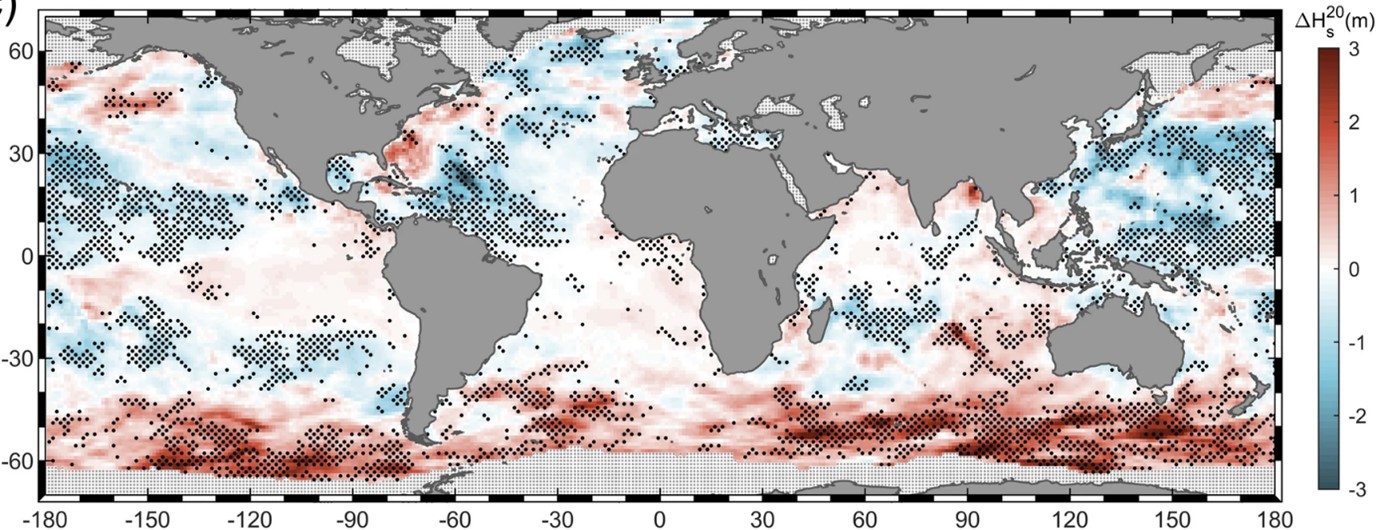 Figura 5. Los colores representan el cambio de la altura de los eventos de marejadas con un periodo de retorno de 20 años bajo un escenario de cambio climático RCP8.5 para finales de siglo (2081–2100, en relación con 1986–2005). Los puntos denotan los cambios estadísticamente significativos al 95 % de nivel de confianza en al menos el 50 % de los modelos utilizados y una concordancia en el signo del cambio en más del 80 % de los modelos. Fuente: Lobeto et al. (2021).