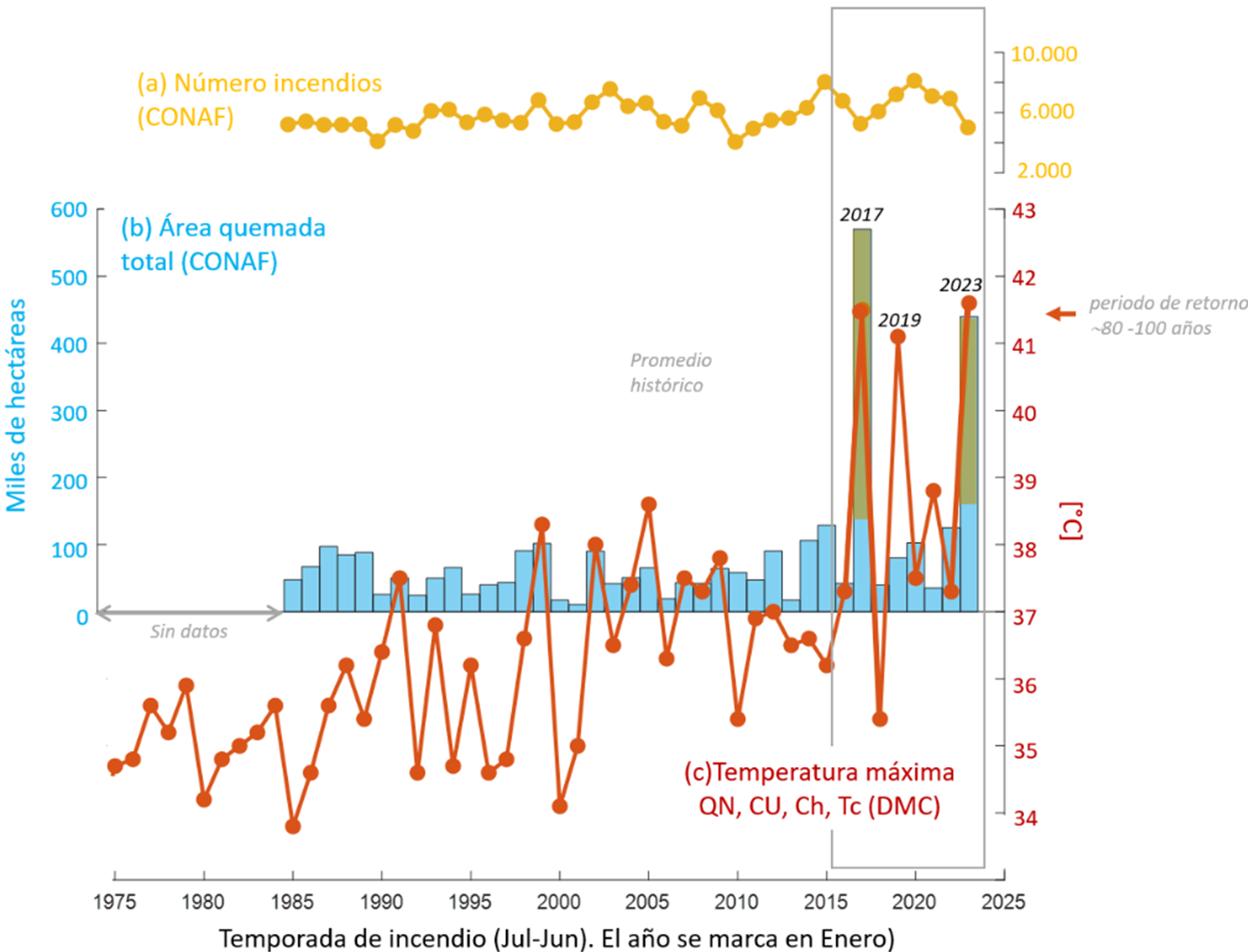 Figura 1. El régimen de incendios forestales en Chile: (a) el número total de eventos (línea amarilla), y (b) área total quemada por temporada (barras celestes). La temporada se extiende desde julio a junio y el año indica el mes de enero de cada temporada. Por ejemplo, la temporada indicada como 2017 se extiende desde julio del 2016 a junio del 2017. Fuente: CONAF. Para las temporadas 2017 y 2023, la parte verde de la barra indica el área quemada en los megaincendios. La línea roja (panel c) corresponde al valor máximo de la temperatura registrada durante la temporada de incendios en las estaciones meteorológicas de Quinta Normal, Curicó, Chillán y Temuco. Fuente: Dirección Meteorológica de Chile (DMC).