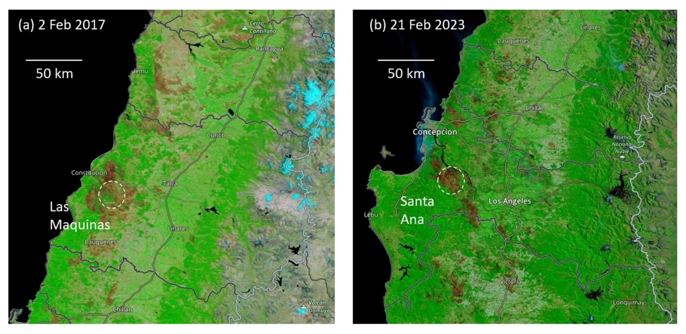 Figura 2. Imágenes del satélite Terra-MODIS (NASA) en la banda 7-2-1, que destaca la vegetación (color verde) y las cicatrices de incendios (tonos rojizos). Las imágenes muestran zonas distintas, pero tienen la misma escala. Como una manera de evidenciar la extensión del incendio, se añadió un círculo blanco que tiene el área de la ciudad de Santiago. El panel (a) es del 2 de febrero de 2017 y exhibe la cicatriz del megaincendio Las Máquinas, entre Constitución y Talca. El panel (b) es del 21 de febrero de 2023 y muestra la cicatriz del megaincendio Santa Ana, entre Concepción y Los Ángeles.