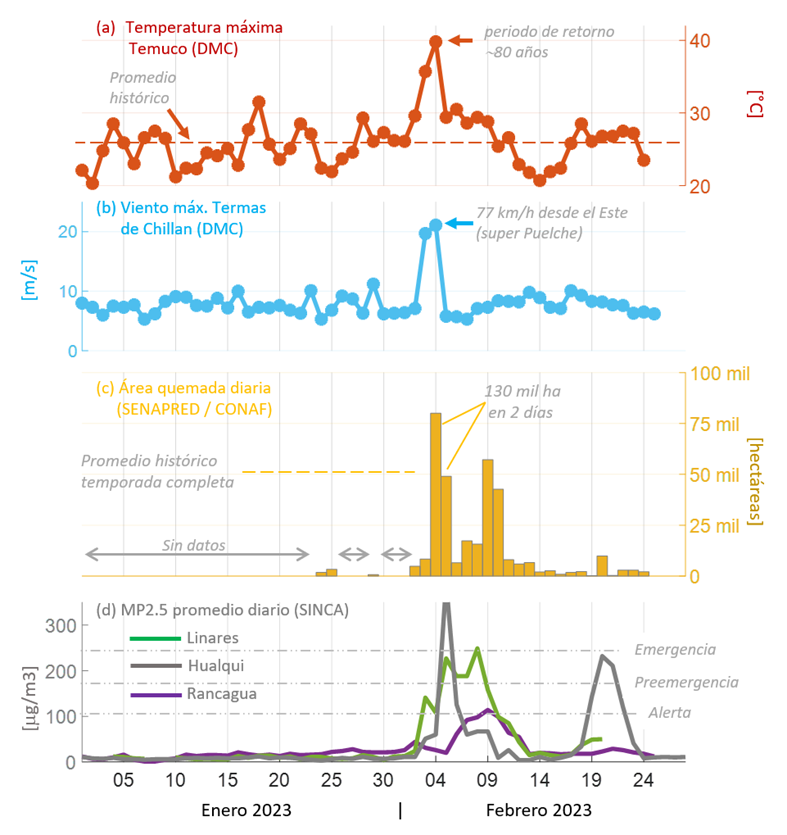 Figura 3. El verano de 2023. Series diarias de (a) temperatura máxima en Temuco y (b) máxima magnitud del viento registrada en la estación Termas de Chillán (DMC). (c) Área quemada diaria (preliminar, CONAF) en todo Chile, mayormente debido a los incendios en las regiones del Ñuble y del Biobío. (d) Promedio diario del material particulado fino (MP2.5) en las estaciones Linares, Hualqui y Rancagua (SINCA-MMA).