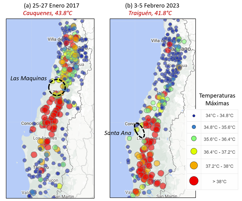 Figura 5. Temperaturas máximas registradas en los días previos y durante el inicio de dos megaincendios en Chile central. El panel (a) muestra el periodo entre el 25 y el 27 enero de 2017 en relación con el incendio de Las Máquinas. El panel (b) muestra el periodo entre el 3 y 5 de febrero de 2023 en relación con el incendio de Santa Ana. El área quemada en cada caso se indica, aproximadamente, por el óvalo de color negro. Fuente: DMC, AgroMet, MeteoRed, CEAZA.
