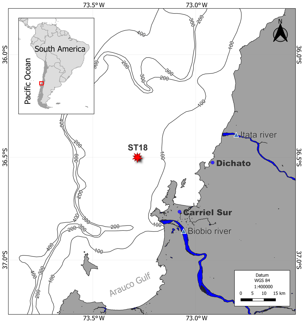 El estudio tuvo lugar en la plataforma continental ubicada frente a la zona central de Chile (Figura 1), donde ocurre un  fenómeno natural conocido como surgencia costera. La surgencia ocurre cuando los vientos que soplan hacia el norte a lo largo de la costa desplazan las aguas superficiales, permitiendo el ascenso de aguas subsuperficiales densas, frías, bajas en oxígeno, ricas en nutrientes, pero con alto contenido de gases de efecto invernadero (GEI) como el CH4 y el CO2. Estas aguas de surgencia fertilizan la zona y favorecen la  productividad biológica y la emisión de GEI hacia la atmósfera, fenómeno que se denomina “desgasificación”. Este proceso ocurre durante la primavera-verano (septiembre a abril) y se debilita en el otoño-invierno (de mayo a agosto; Sobarzo et al., 2007). La diferencia estacional de la surgencia influye en la temperatura del océano, en la salinidad, el oxígeno disuelto, los nutrientes y las concentraciones superficiales de clorofila (Aguirre et al., 2012).